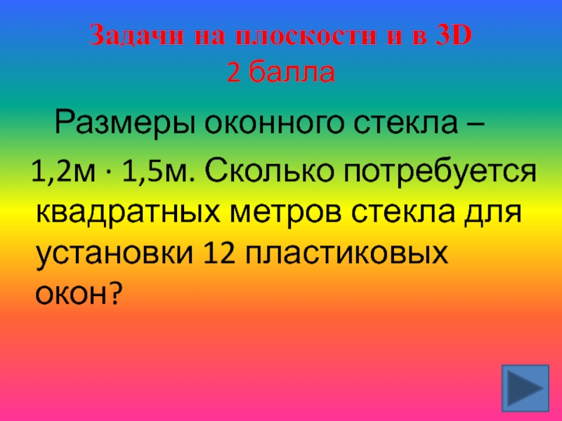 Задачи на плоскости и в 3D 2 балла    Размеры оконного стекла –  1,2м