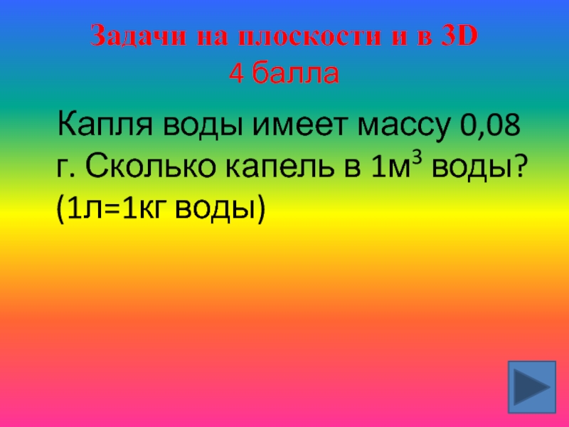 Задачи на плоскости и в 3D  4 балла  Капля воды имеет массу 0,08 г. Сколько