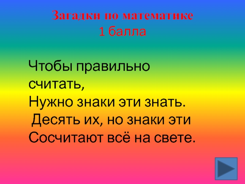 Загадки по математике 1 баллаЧтобы правильно считать, Нужно знаки эти знать. Десять их, но знаки эти Сосчитают