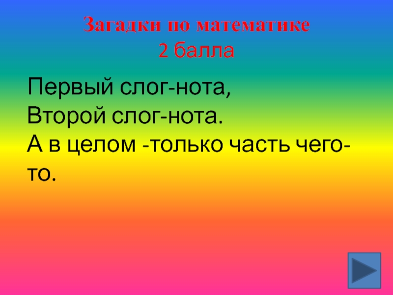 Загадки по математике 2 баллаПервый слог-нота,Второй слог-нота.А в целом -только часть чего-то.
