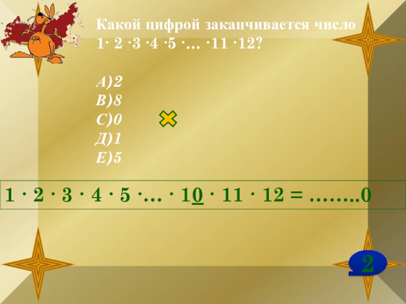 1 ∙ 2 ∙ 3 ∙ 4 ∙ 5 ∙… ∙ 10 ∙ 11 ∙ 12 = ……..0