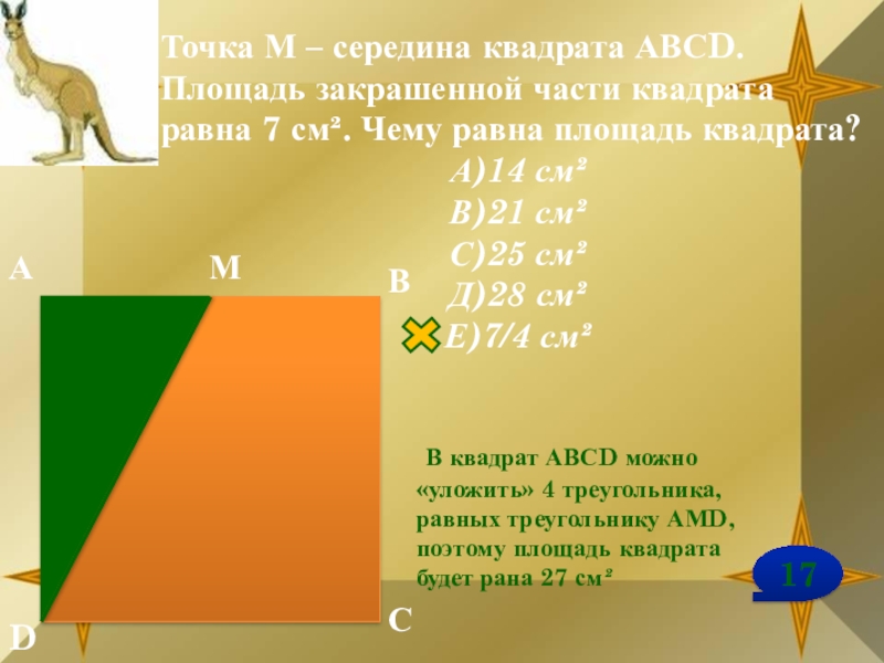 В квадрат АВСD можно «уложить» 4 треугольника, равных треугольнику АМD, поэтому площадь квадрата будет рана 27 см²