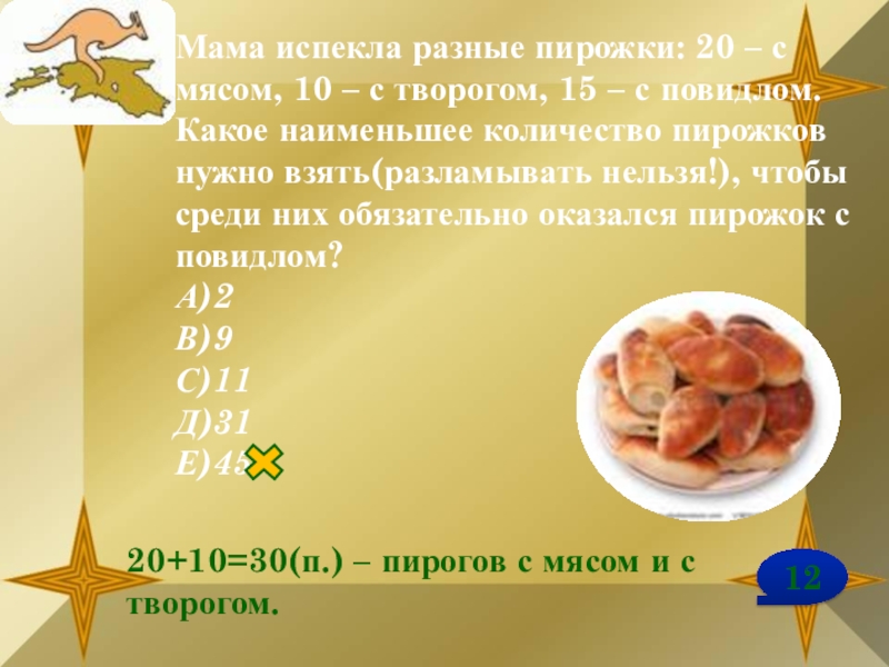 20+10=30(п.) – пирогов с мясом и с творогом.