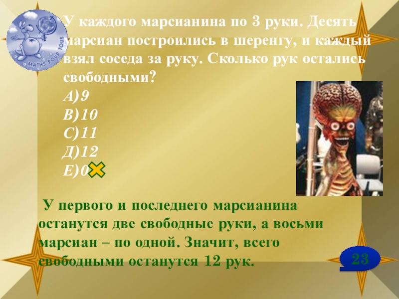 У первого и последнего марсианина останутся две свободные руки, а восьми марсиан – по одной. Значит, всего свободными останутся 12 рук.
