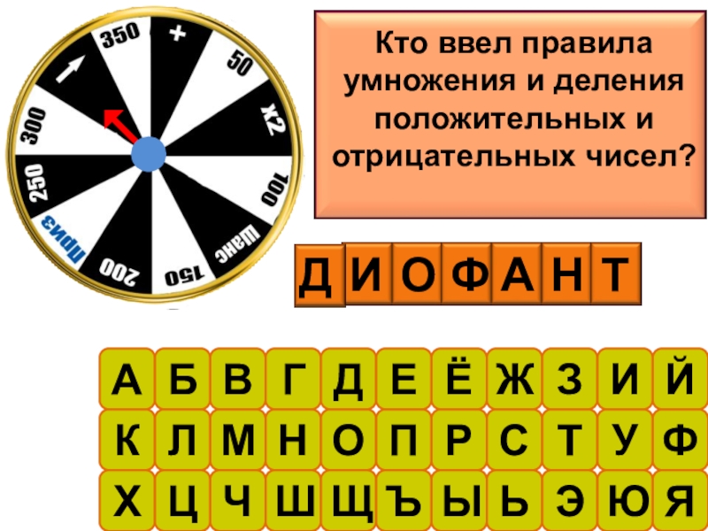 АБВГДЕЁЖЗИЙКЛМНОПРСТУФХЦЧШЩЪЫЬЭЮЯКто ввел правила умножения и деления положительных и отрицательных чисел?ДИОФАНТ