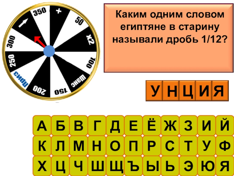 АБВГДЕЁЖЗИЙКЛМНОПРСТУФХЦЧШЩЪЫЬЭЮЯКаким одним словом египтяне в старину называли дробь 1/12?УНЦИЯ