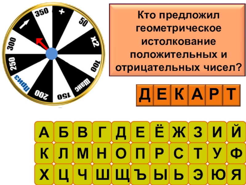 АБВГДЕЁЖЗИЙКЛМНОПРСТУФХЦЧШЩЪЫЬЭЮЯКто предложил геометрическое истолкование положительных и отрицательных чисел?ДЕКАРТ