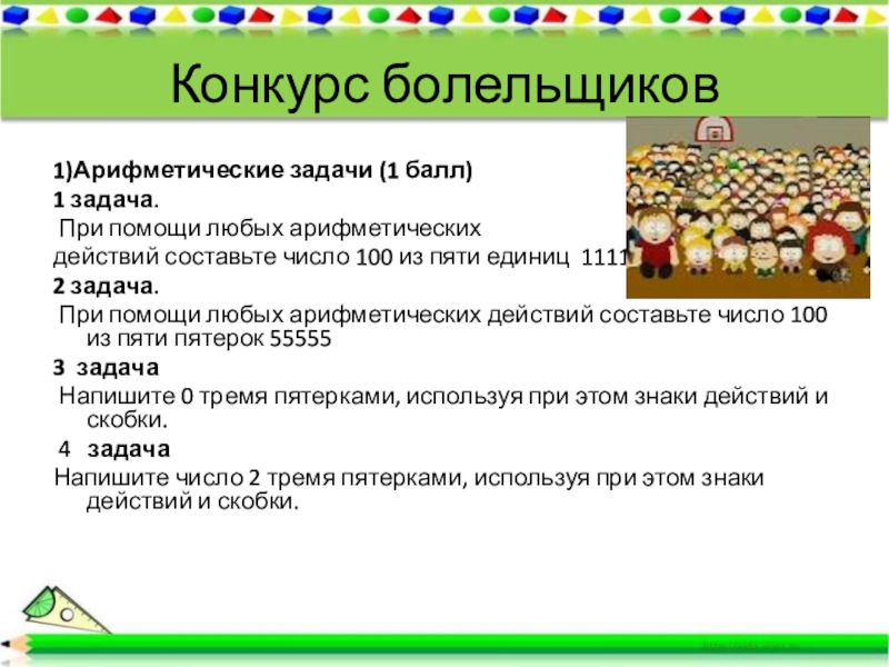 Напишите число 2 тремя пятерками, используя при этом знаки действий и скобки. (5 + 5) : 5 = 2).