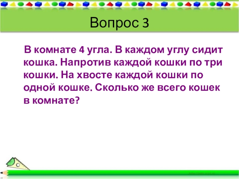 кошка. Напротив каждой кошки по три кошки. На хвосте каждой кошки по одной кошке. Сколько же всего кошек в комнате?