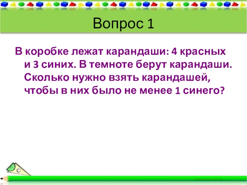 темноте берут карандаши. Сколько нужно взять карандашей, чтобы в них было не менее 1 синего?