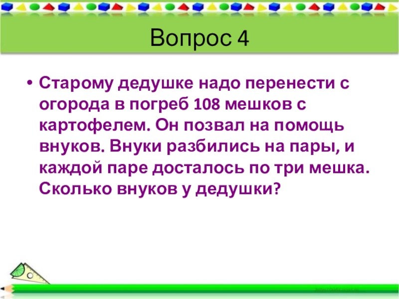 с картофелем. Он позвал на помощь внуков. Внуки разбились на пары, и каждой паре досталось по три мешка. Сколько внуков у дедушки?