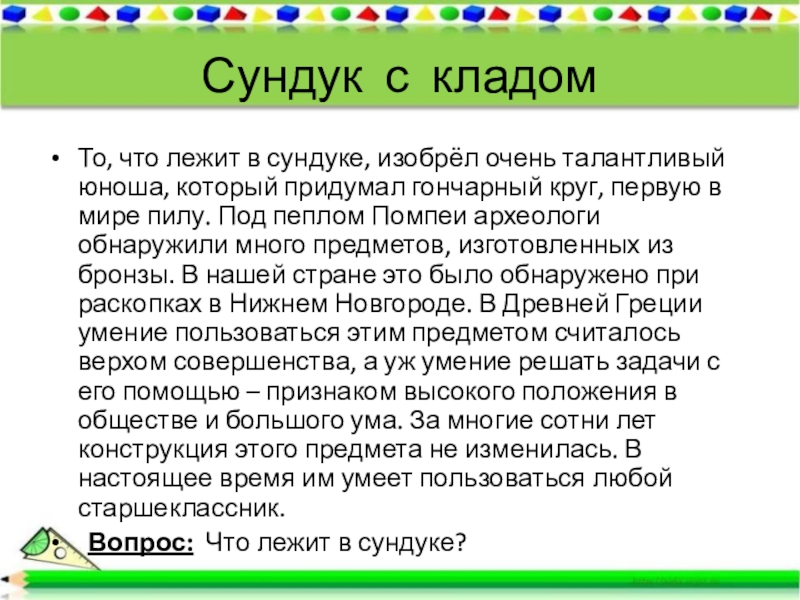 который придумал гончарный круг, первую в мире пилу. Под пеплом Помпеи археологи обнаружили много предметов, изготовленных из бронзы. В нашей стране это было обнаружено при раскопках в Нижнем Новгороде. В Древней Греции умение пользоваться этим предметом считалось верхом совершенства, а уж умение решать задачи с его помощью – признаком высокого положения в обществе и большого ума. За многие сотни лет конструкция этого предмета не изменилась. В настоящее время им умеет пользоваться любой старшеклассник.