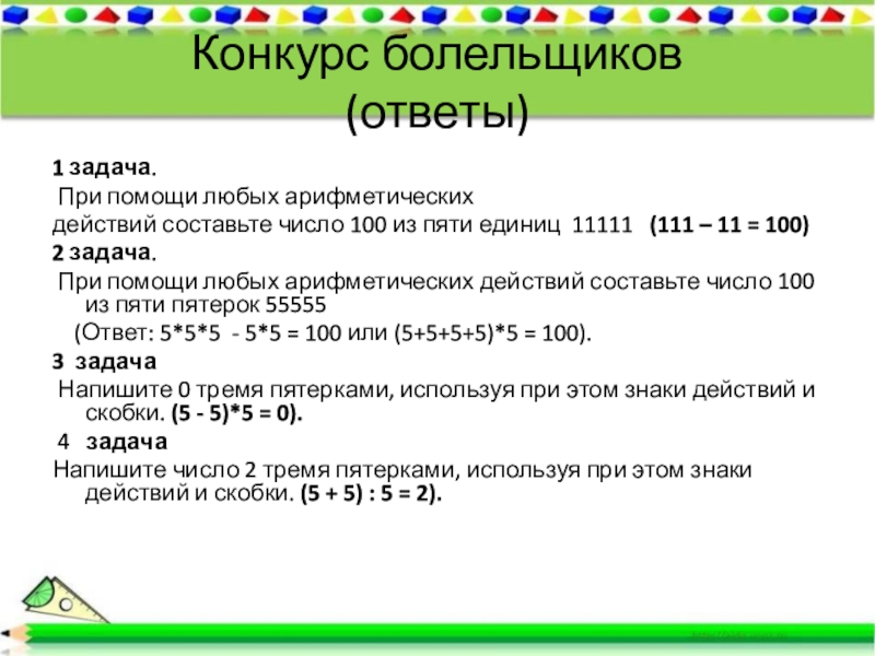 Напишите 0 тремя пятерками, используя при этом знаки действий и скобки.