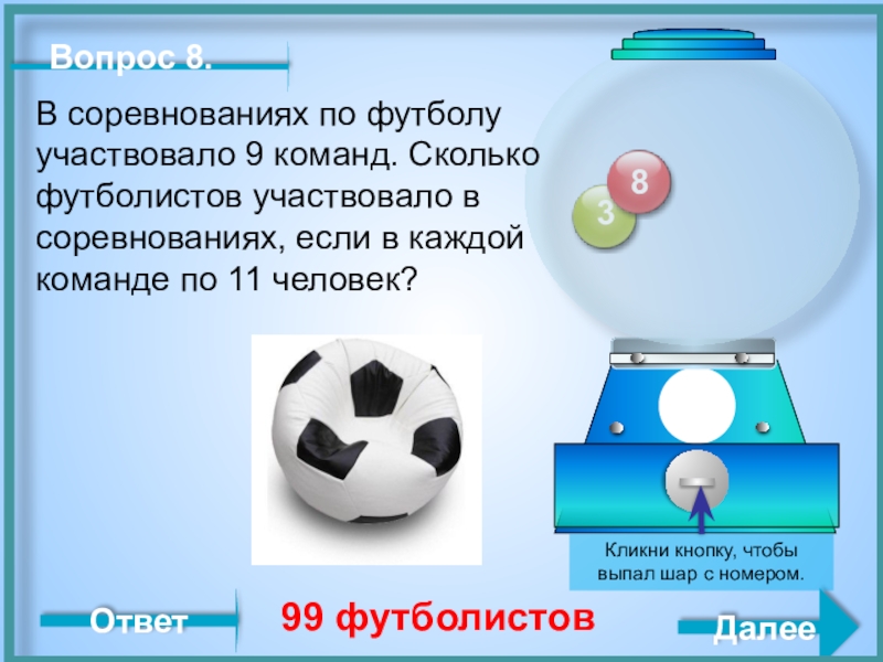В соревнованиях по футболу участвовало 9 команд. Сколько футболистов участвовало в соревнованиях, если в каждой команде по 11 человек?