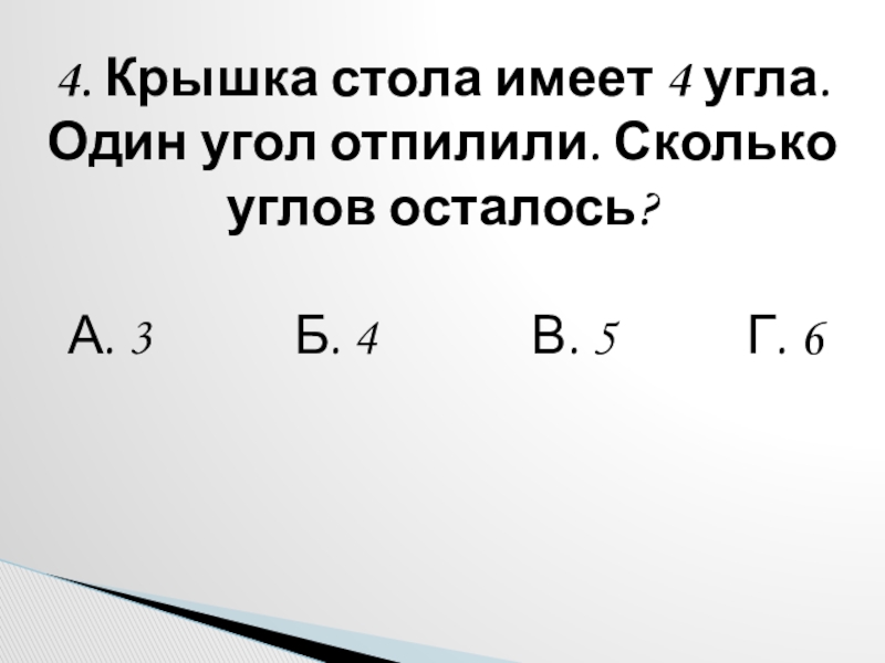 Слайд 314. Крышка стола имеет 4 угла. Один угол отпилили. Сколько углов