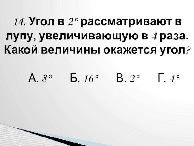 Слайд 4314. Угол в 2 рассматривают в лупу, увеличивающую в 4 раза.