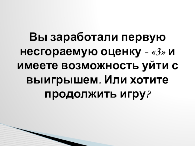 Слайд 13Вы заработали первую несгораемую оценку - «3» и имеете возможность уйти