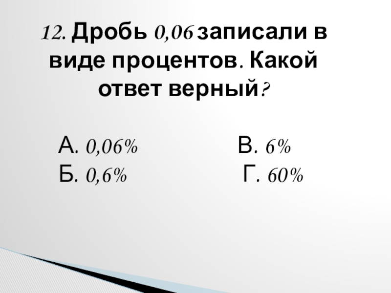Слайд 4112. Дробь 0,06 записали в виде процентов. Какой ответ верный?