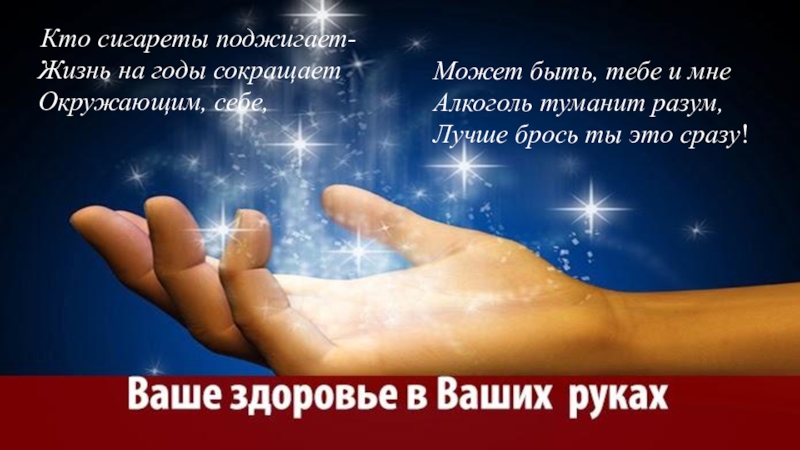 Кто сигареты поджигает-   Жизнь на годы сокращает   Окружающим, себе,   Может