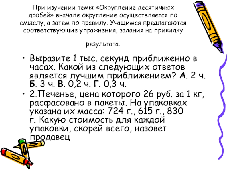 Слайд 13При изучении темы «Округление десятичных дробей» вначале округление осуществляется по смыслу,