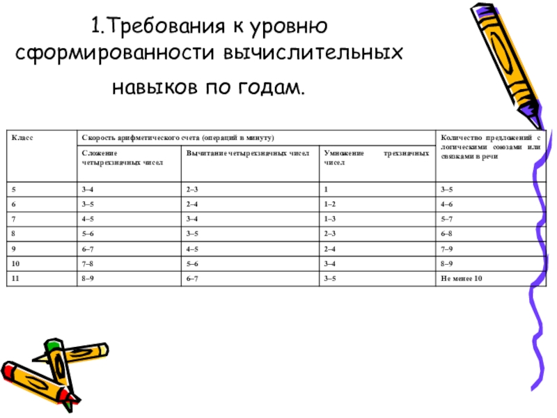 Слайд 181.Требования к уровню сформированности вычислительных навыков по годам.