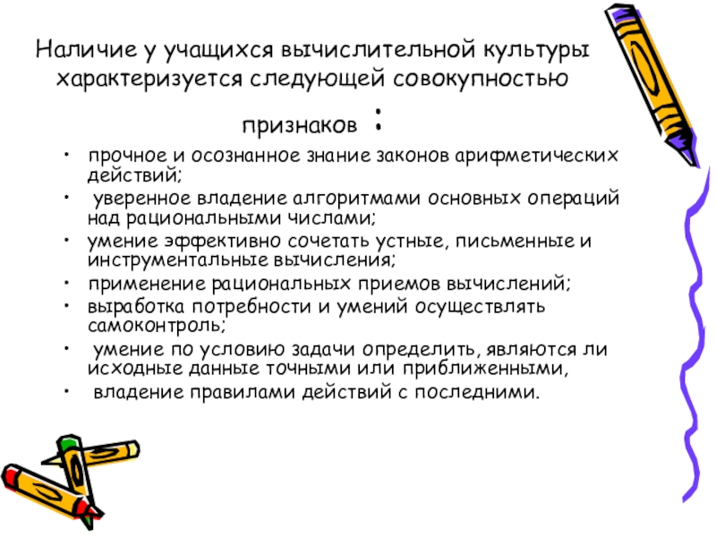 Слайд 7Наличие у учащихся вычислительной культуры характеризуется следующей совокупностью признаков :