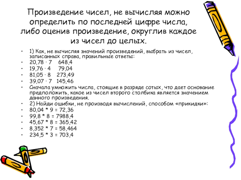 1) Как, не вычисляя значений произведений, выбрать из чисел, записанных справа, правильные ответы: