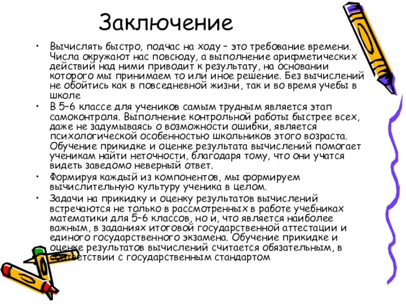 Задачи на прикидку и оценку результатов вычислений встречаются не только в рассмотренных в работе учебниках математики для 5–6 классов, но и, что является наиболее важным, в заданиях итоговой государственной аттестации и единого государственного экзамена. Обучение прикидке и оценке результатов вычислений считается обязательным, в соответствии с государственным стандартом
