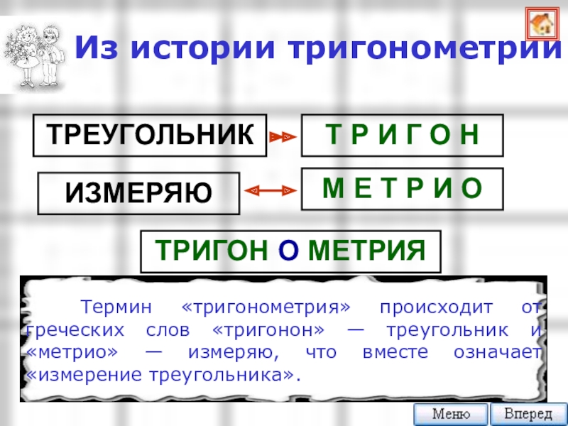 Термин «тригонометрия» происходит от греческих слов «тригонон» — треугольник и «метрио» — измеряю, что вместе означает «измерение треугольника».
