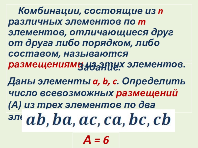 Даны элементы a, b, c. Определить число всевозможных размещений (А) из трех элементов по два элемента.