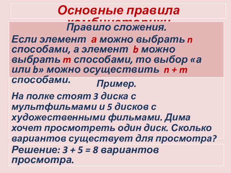 На полке стоят 3 диска с мультфильмами и 5 дисков с художественными фильмами. Дима хочет просмотреть один диск. Сколько вариантов существует для просмотра?