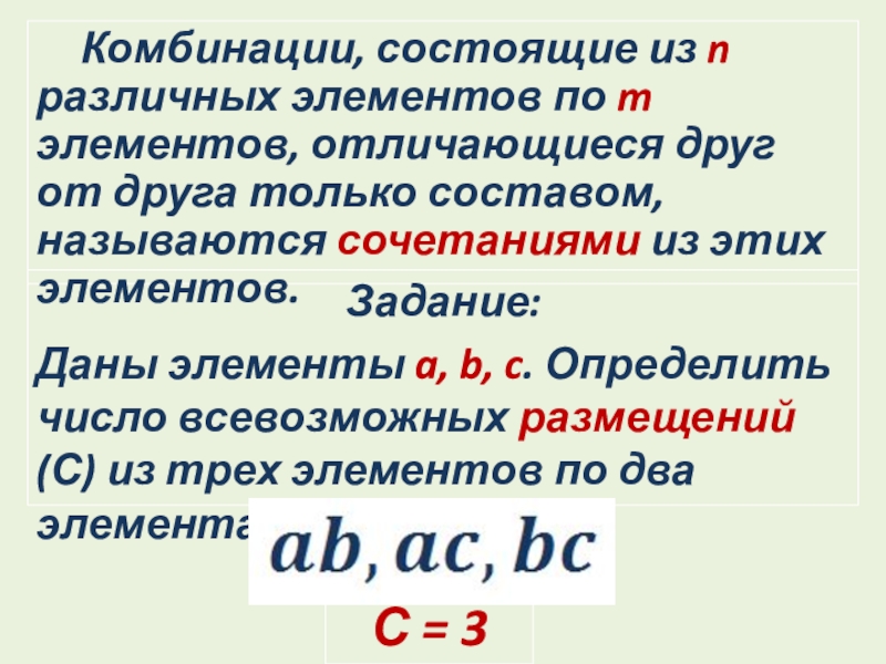 Даны элементы a, b, c. Определить число всевозможных размещений (С) из трех элементов по два элемента.