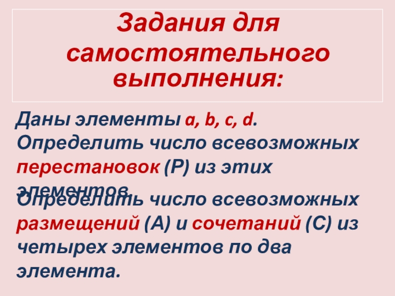 Определить число всевозможных размещений (А) и сочетаний (С) из четырех элементов по два элемента.
