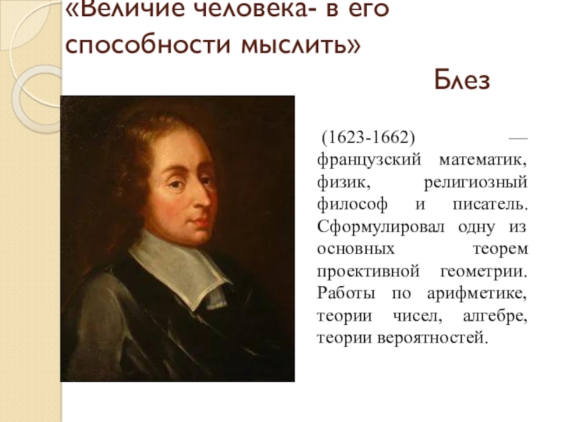 (1623-1662) — французский математик, физик, религиозный философ и писатель. Сформулировал одну из основных теорем проективной геометрии. Работы по арифметике, теории чисел, алгебре, теории вероятностей.