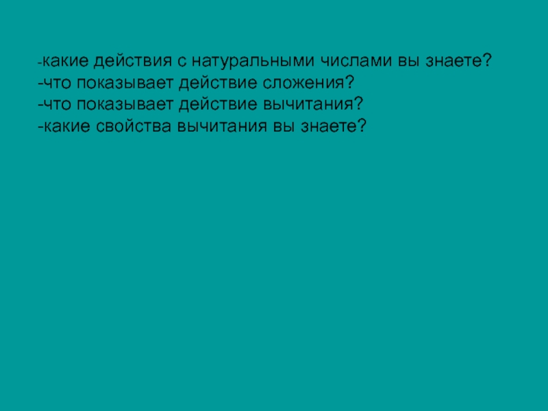 -какие действия с натуральными числами вы знаете?-что показывает действие сложения?-что показывает действие вычитания?-какие свойства вычитания вы знаете?