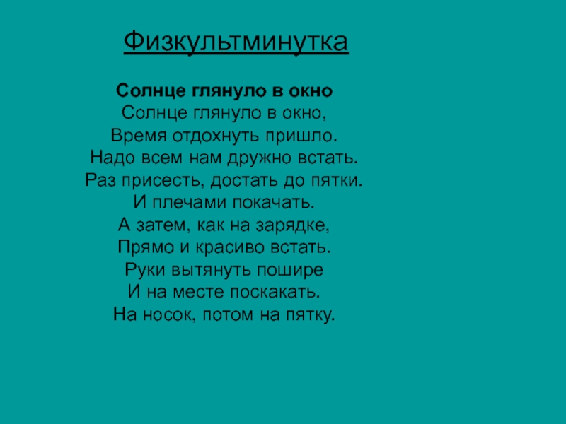 ФизкультминуткаСолнце глянуло в окноСолнце глянуло в окно,Время отдохнуть пришло.Надо всем нам дружно встать.Раз присесть, достать до пятки.И