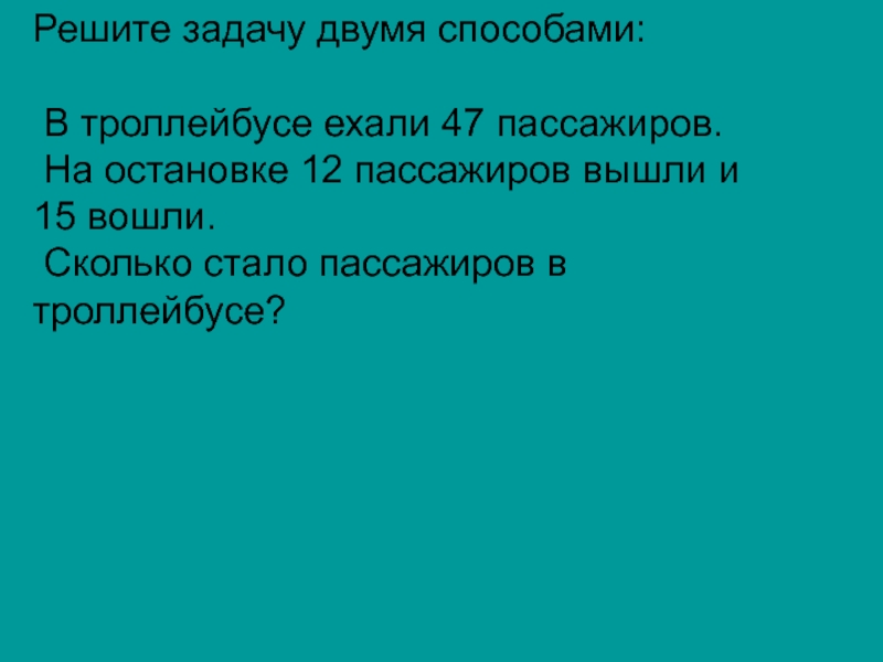 Решите задачу двумя способами:  В троллейбусе ехали 47 пассажиров. На остановке 12 пассажиров вышли и 15 вошли.