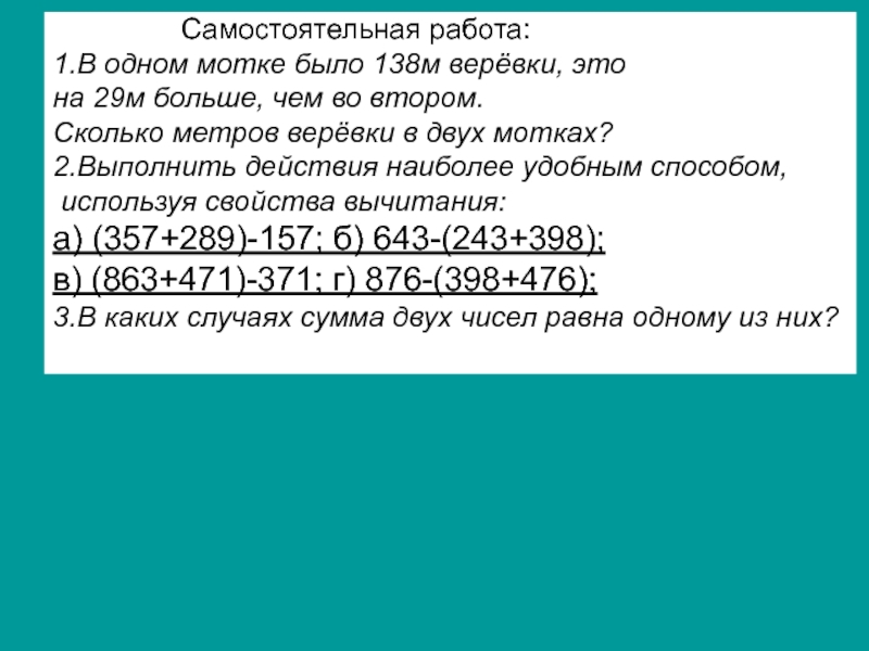 Самостоятельная работа:1.В одном мотке было 138м верёвки, этона 29м