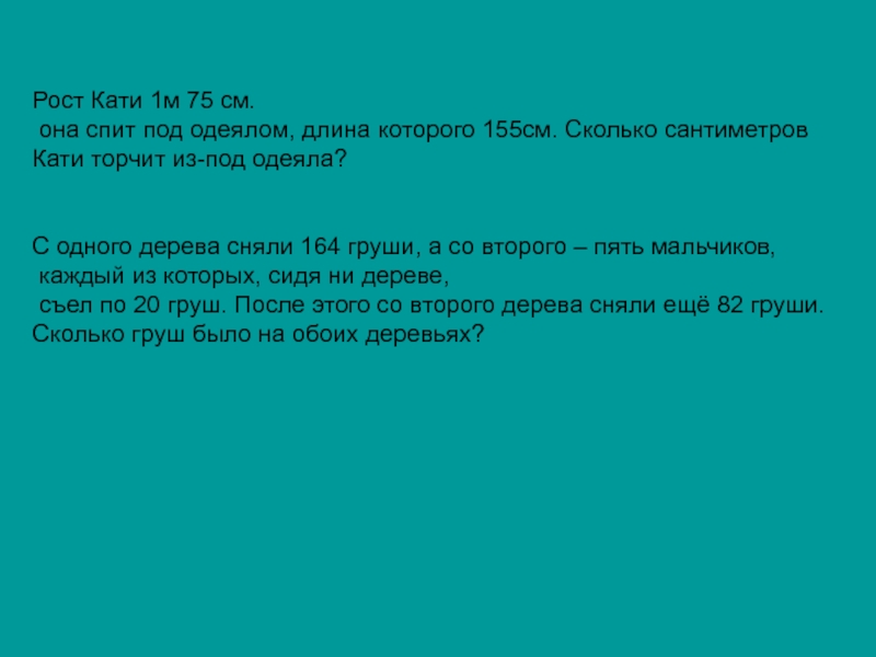 Рост Кати 1м 75 см. она спит под одеялом, длина которого 155см. Сколько сантиметров Кати торчит из-под