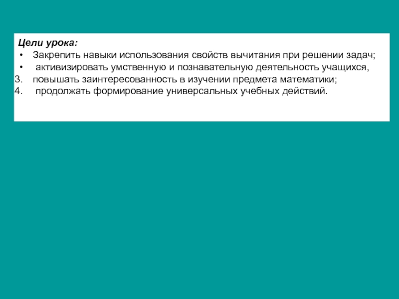 Цели урока: Закрепить навыки использования свойств вычитания при решении задач; активизировать умственную и познавательную деятельность учащихся,повышать заинтересованность в изучении предмета математики; продолжать формирование универсальных учебных действий.