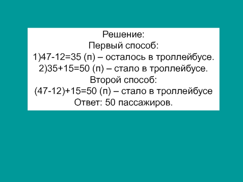 Решение:Первый способ:1)47-12=35 (п) – осталось в троллейбусе. 2)35+15=50 (п) – стало в троллейбусе.Второй способ:(47-12)+15=50 (п) – стало