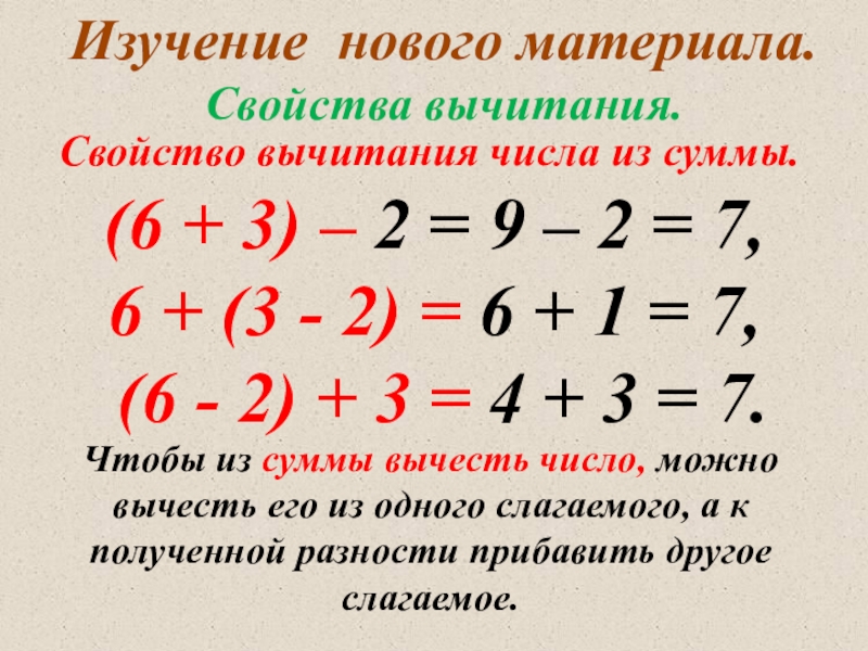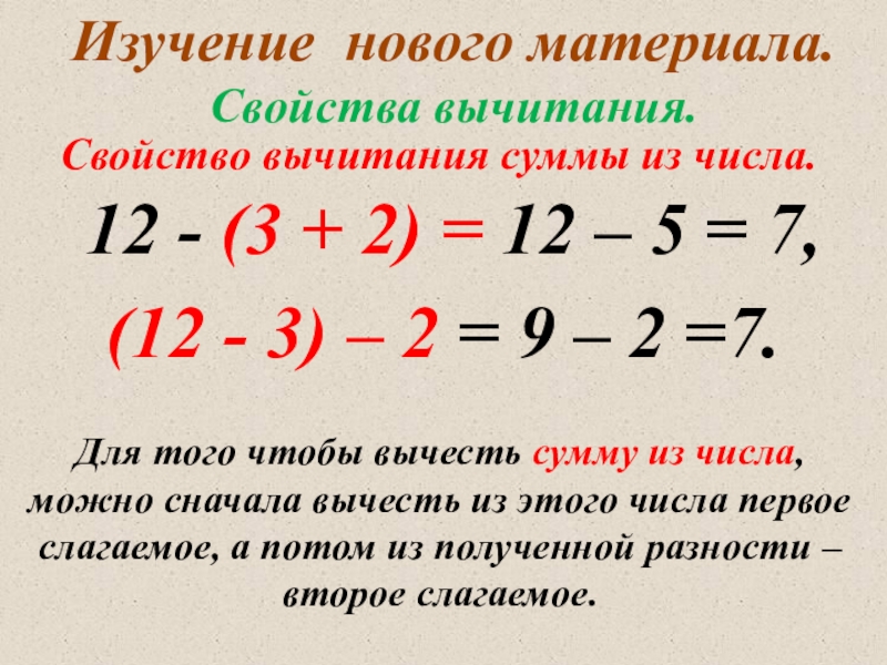 Для того чтобы вычесть сумму из числа, можно сначала вычесть из этого числа первое слагаемое, а потом из полученной разности – второе слагаемое.