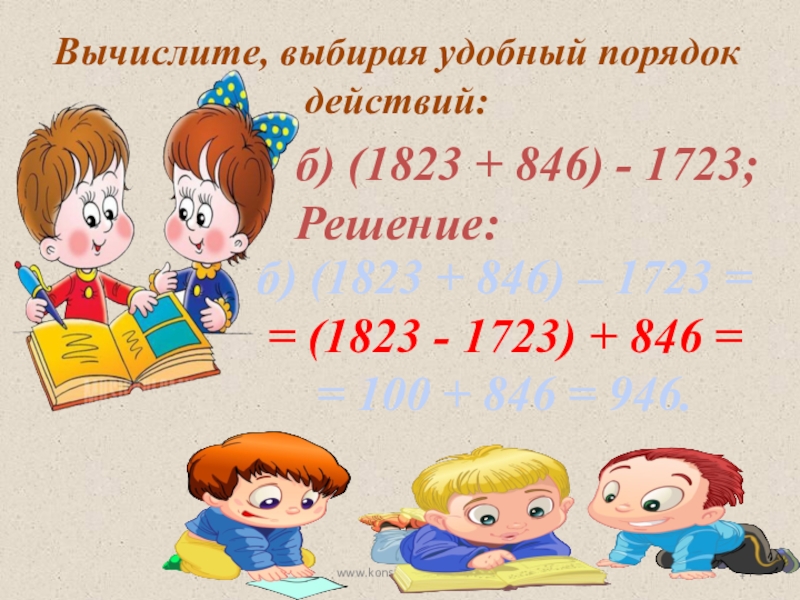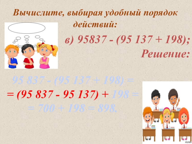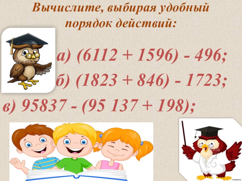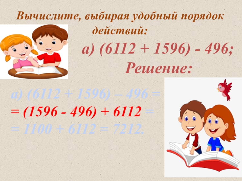 Чтобы из суммы вычесть число, можно вычесть его из одного слагаемого, а к полученной разности прибавить другое слагаемое.