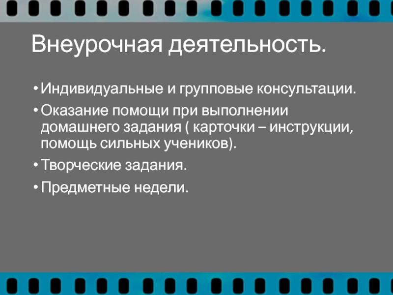 Внеурочная деятельность.Индивидуальные и групповые консультации.Оказание помощи при выполнении домашнего задания ( карточки – инструкции, помощь сильных учеников).Творческие