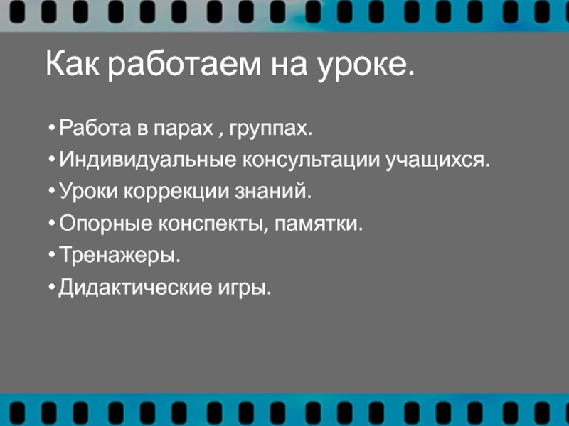 Как работаем на уроке.Работа в парах , группах.Индивидуальные консультации учащихся.Уроки коррекции знаний.Опорные конспекты, памятки.Тренажеры.Дидактические игры.