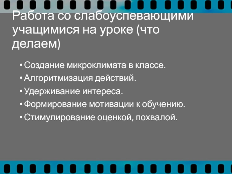 Работа со слабоуспевающими учащимися на уроке (что делаем)Создание микроклимата в классе.Алгоритмизация действий.Удерживание интереса.Формирование мотивации к обучению.Стимулирование оценкой,