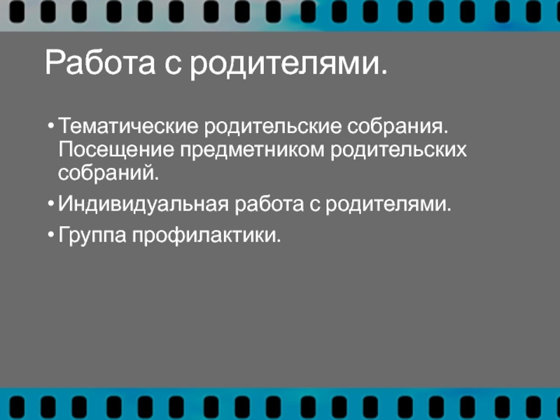 Работа с родителями.Тематические родительские собрания. Посещение предметником родительских собраний.Индивидуальная работа с родителями.Группа профилактики.