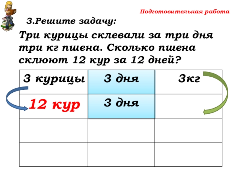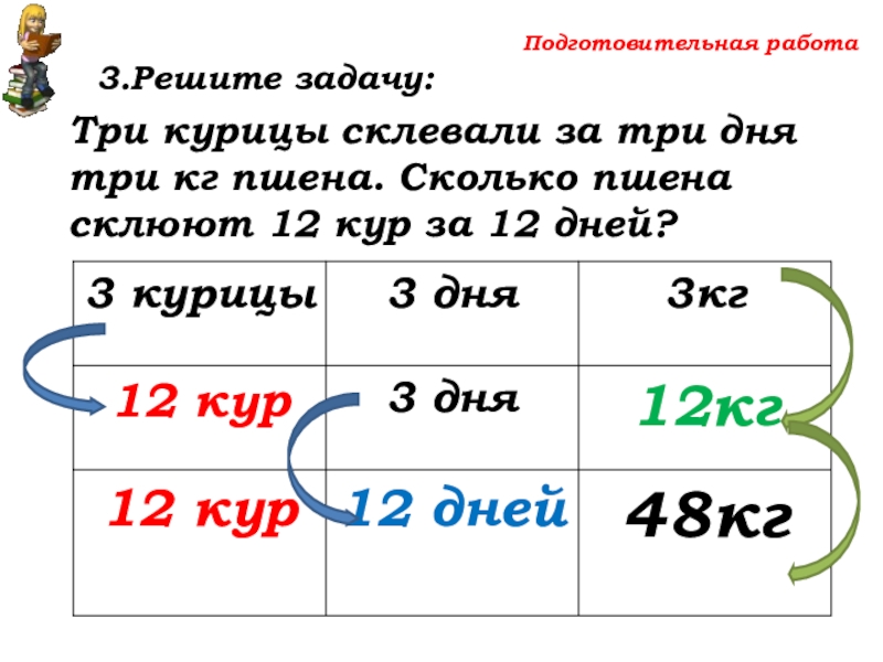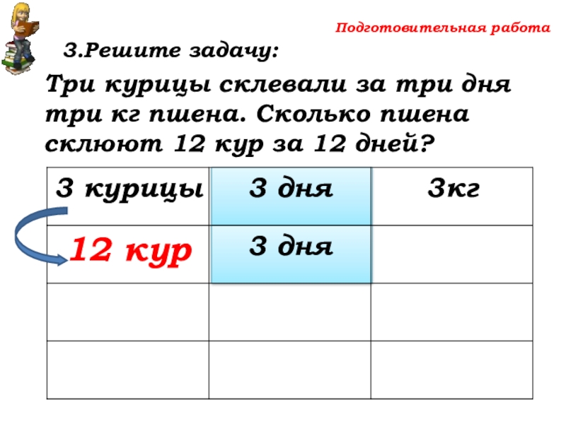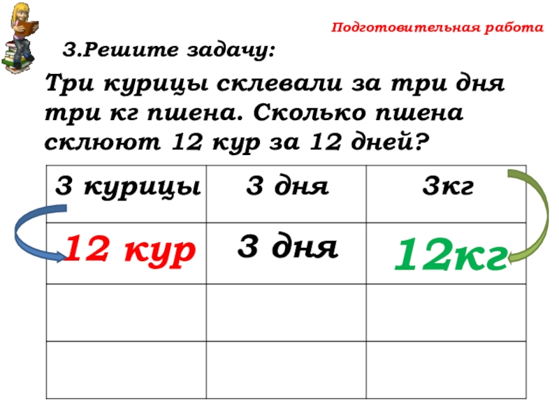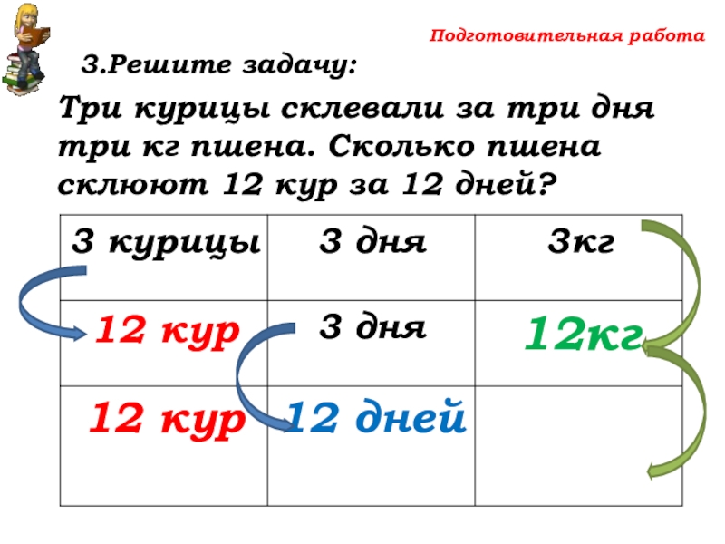 Сколько пшена склюют 12 кур за 12 дней?