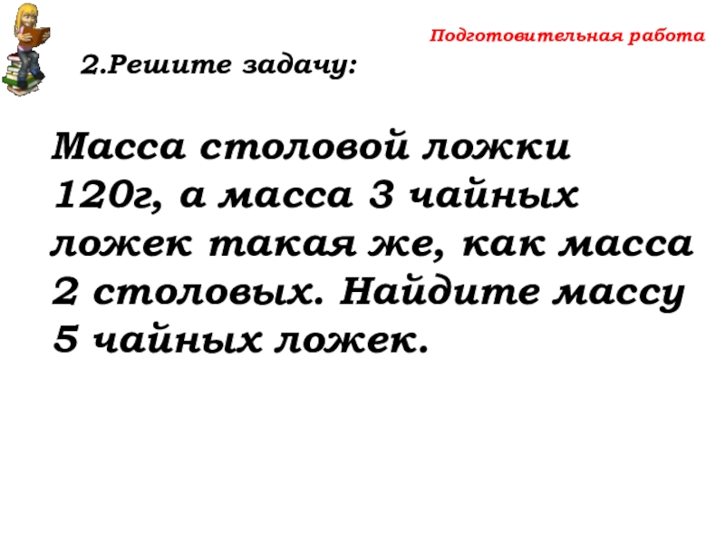такая же, как масса 2 столовых. Найдите массу 5 чайных ложек.