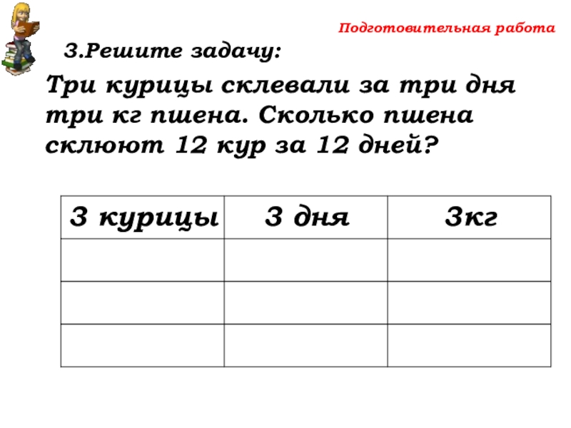 Три курицы склевали за три дня три кг пшена.